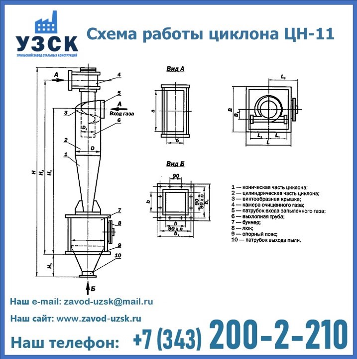Стандартно циклон, осуществляющий очистку воздушного потока, представляет собой конструкцию из: